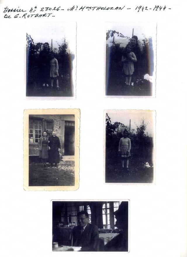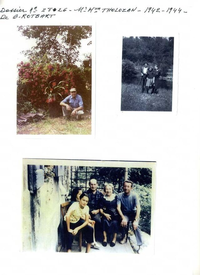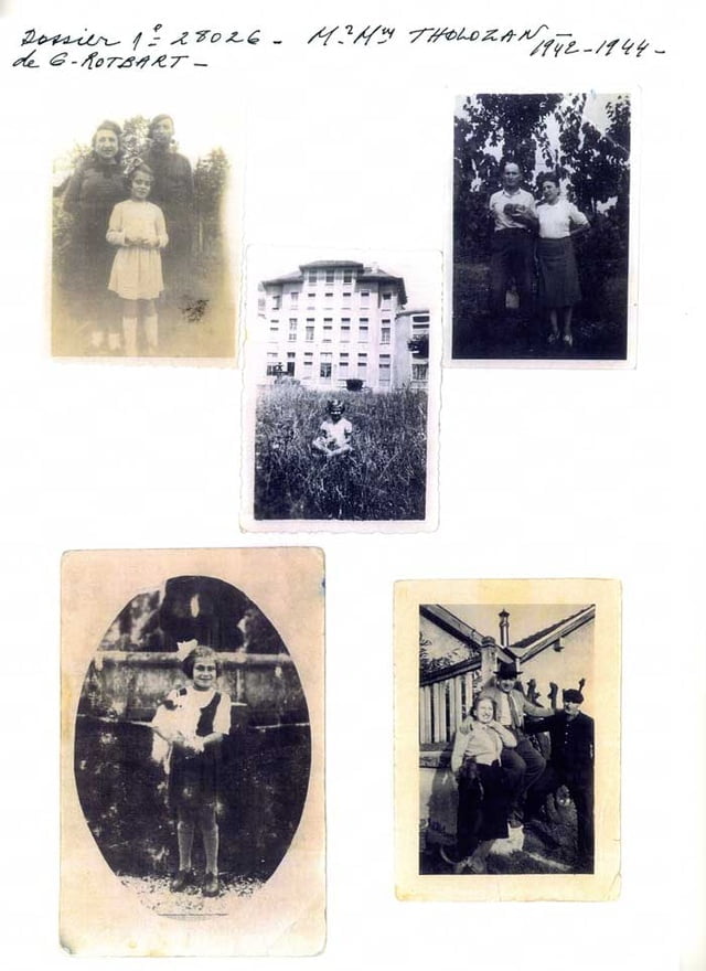 Les grands-parents de Gisèle ROTBART, Salomon et Guitta, sont originaire de Pologne. Ils ont trois garçons et une fille. Le père de Gisèle, Haïm, rejoint son frère à Paris. Il y rencontre sa femme, Zelda. Une fille naît, Gisèle, en juillet 1937. Sa mère refuse de s’en occuper. Le 18 juillet 1942, Gisèle, son père, son oncle et sa tante quittent Paris en taxi. Gisèle est placée en nourrice en Isère. Elle n’y est pas bien traitée. Son père, qui est caché non loin de sa fille, s’inquiète. Grâce à une connaissance, il peut confier la petite à Joseph et Marie THOLOZAN vers la mi 1942. Mme THOLOZAN gratte une lettre sur une carte d’alimentation et Gisèle devient ROIBART.