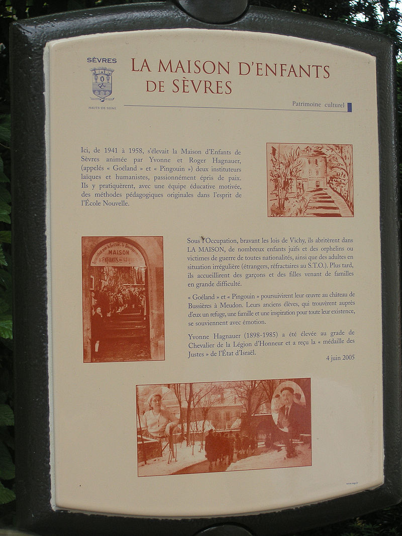 « Ici, de 1941 à 1958, s’élevait la Maison d’enfants de Sèvres, animée par Yvonne et Roger Hagnauer (appelés Goéland et Pingouin), deux instituteurs laïques et humanistes, passionnément épris de paix, qui y pratiquèrent, avec une équipe éducative motivée, des méthodes pédagogiques originales dans l’esprit de l’École nouvelle. Sous l’occupation, bravant les lois de Vichy, ils abritèrent, dans la maison, de nombreux enfants juifs et des orphelins ou victimes de guerre de toutes nationalités, ainsi que des adultes en situation irrégulière (étrangers, résistants, réfractaires au STO).