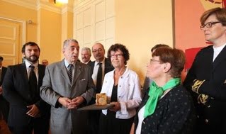 A la mairie de Nay, Michèle Lucante, petite-nièce de Thérèse Trébuquet, reçoit la médaille des Justes des mains de Michel Alitenssi, délégué régional de Yad Vashem. (Ascencion Torrent)