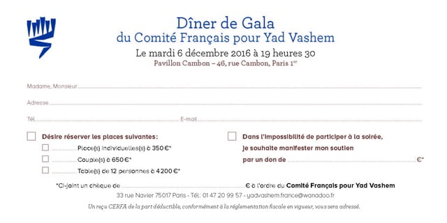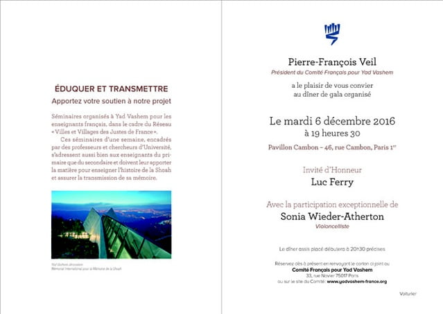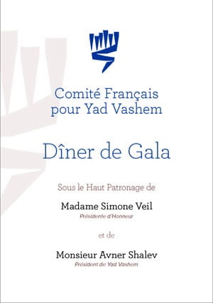 Dîner de Gala du Comité Français pour Yad Vashem le mardi 10 décembre 2019 à l’InterContinental Paris – Le Grand – 2 rue Scribe 75009 Paris Invité d’honneur Anne Sinclair