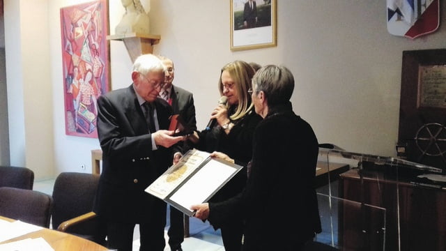 Anita Mazor, Ministre, remet la Médaille des Justes et le Diplôme à Yvette Paturel, devant Raymond Strompf