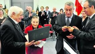 Cérémonie émouvante hier. Deux familles réunies : Roger Cénou qui a reçu la médaille des Justes pour ses grands-parents et la dernière survivante de la famille Lévy cachée pendant la guerre.
