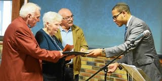 Shimon Mercer Wood, porte-parole de l’ambassade d’Israël a remis aux petits-enfants d’Alexandre Dubos, Paul, Catherine et Alexandre, la médaille et le diplôme du titre de Juste parmi les Nations. © Le Télégramme https://www.letelegramme.fr/cotes-darmor/ga