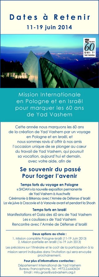 Yad Vashem souhaite rassembler tous ses amis de longue date, ainsi que la nouvelle génération, pour un voyage de mémoire et de transmission ; un voyage « de Pologne en Israël », du 11 au 19 juin 2014.