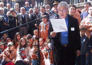 En mai 2004 autour de la nouvelle génération de jeunes éclaireurs israélites, des anciens de la maison d'enfants de Moissac, Jean-Claude Simon se souvient de la solidarité des Moissagais durant la guerre./ Photo DDM,