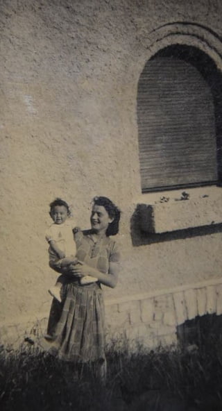 Albertine Roche a 19 ans sur cette photographie. Elle tient Gérard Azouvi dans ses bras, à Villecien, dans l’Yonne. Gérard Roche vit toujours au domaine familial à Mondragon.