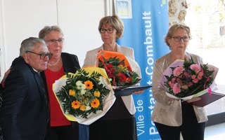 Pontault-Combault, ce dimanche matin. Jean Zylber embrasse Françoise, l’une des trois petites-filles (à dr.) de Marcel et Maximilienne Nadaud, un couple de Pontault qui l’a sauvé des nazis en le cachant lorsqu’il était enfant. LP/Marine Legrand