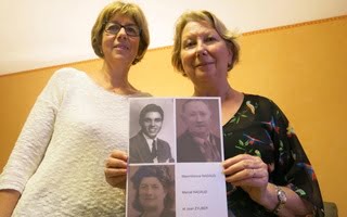 Vert-Saint-Denis, ce jeudi. Chantal (à droite) et Dominique, deux des trois petites-filles de Marcel et Maximilienne Nadaud, avec les photos de leurs grands-parents et de Jean Zylber à 14 ans. LP/Sébastien Blondé