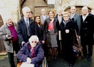 Yvette Lefebvre (assise et accompagnée de son fils) devant l'entrée de la maison de ses parents Cécilia et Paul, en compagnie de Mme le consul,le maire,la députée,le préfet, les conseillers général et régional.
