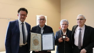 De gauche à droite : René Riaud, maire, Alain de Gorce et Marie-France Jarnier (descendants des trois médaillés) et Simon Grinsztajn, juif sauvé par des Bretons pendant la guerre 39-45. Ouest france